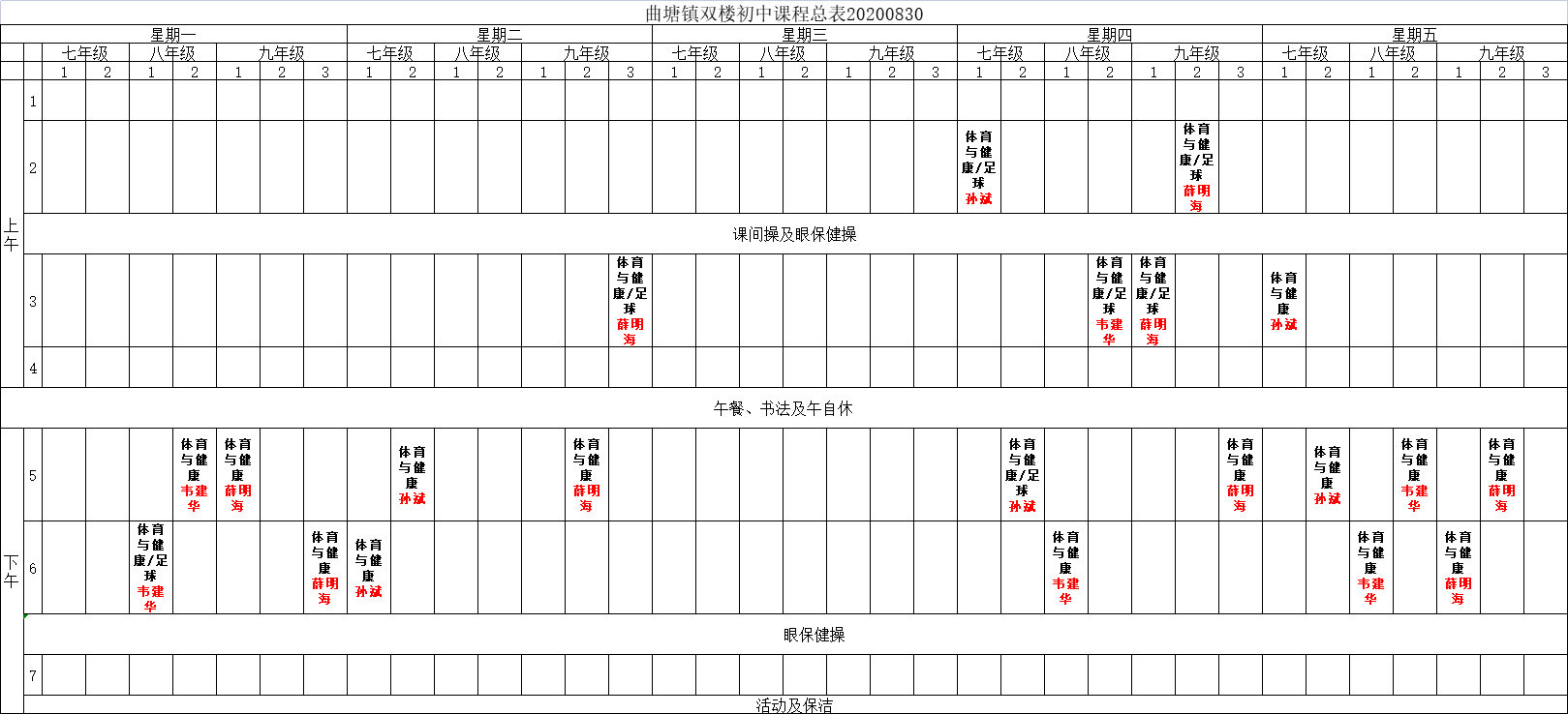 双楼初中2020年度体育与健康课程表及体育活动课公示